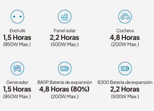 – Tiempo de carga: 0–80 % en 50 min vía corriente / 3 h aprox. vía panel solar