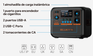 – Salidas: 2 AC, 1 USB-C PD 65 W, 4 USB-A, 1 cargador inalámbrico, 1 salida auto 12 V